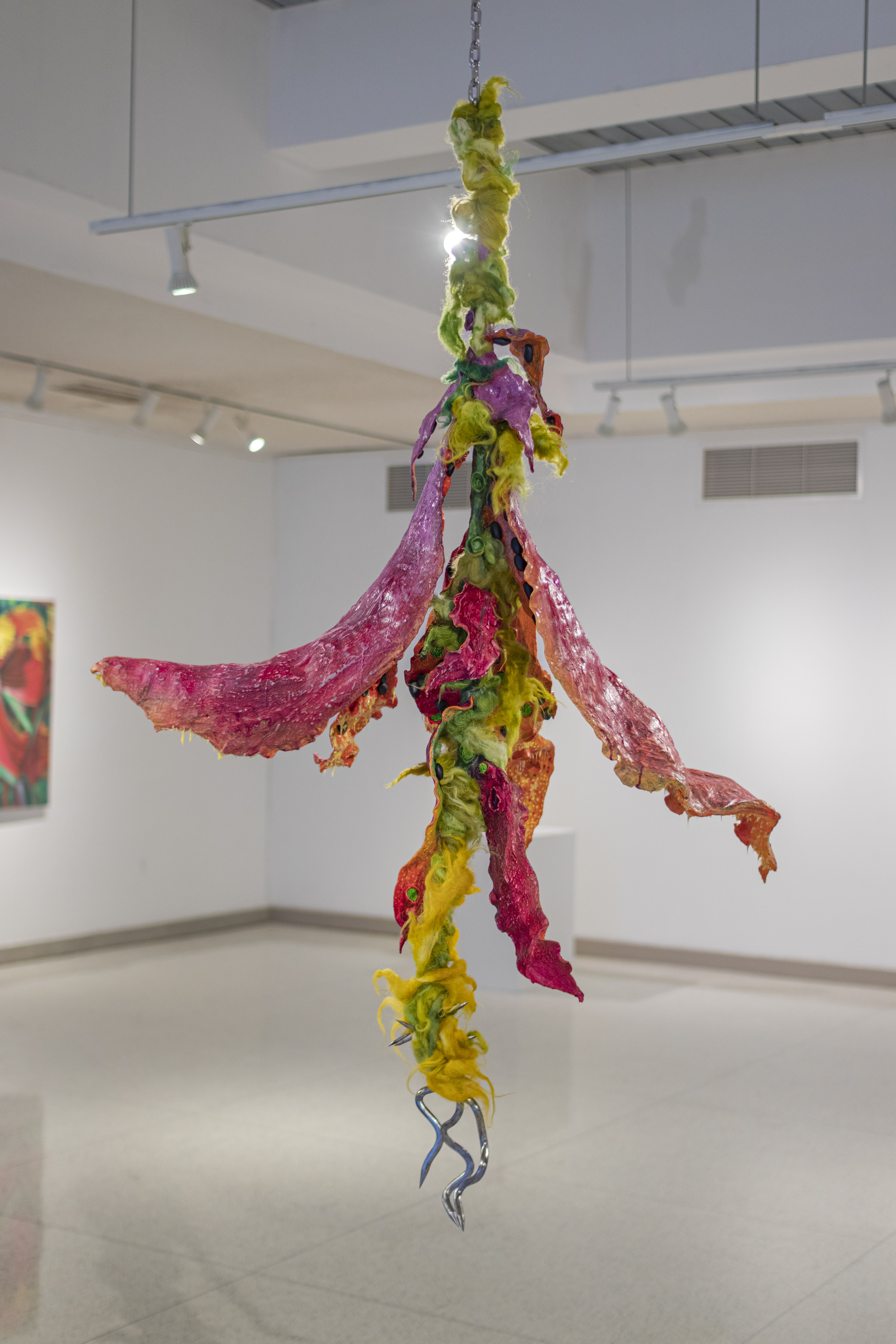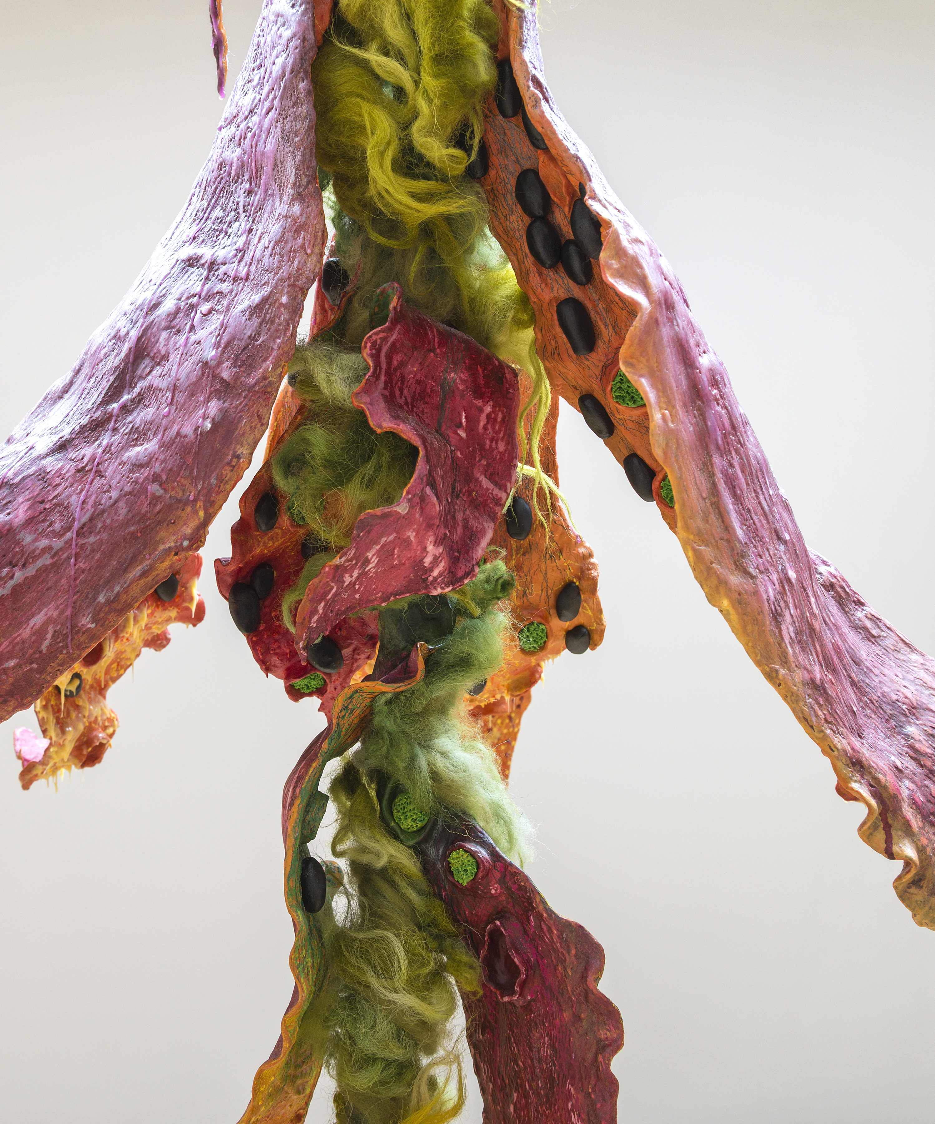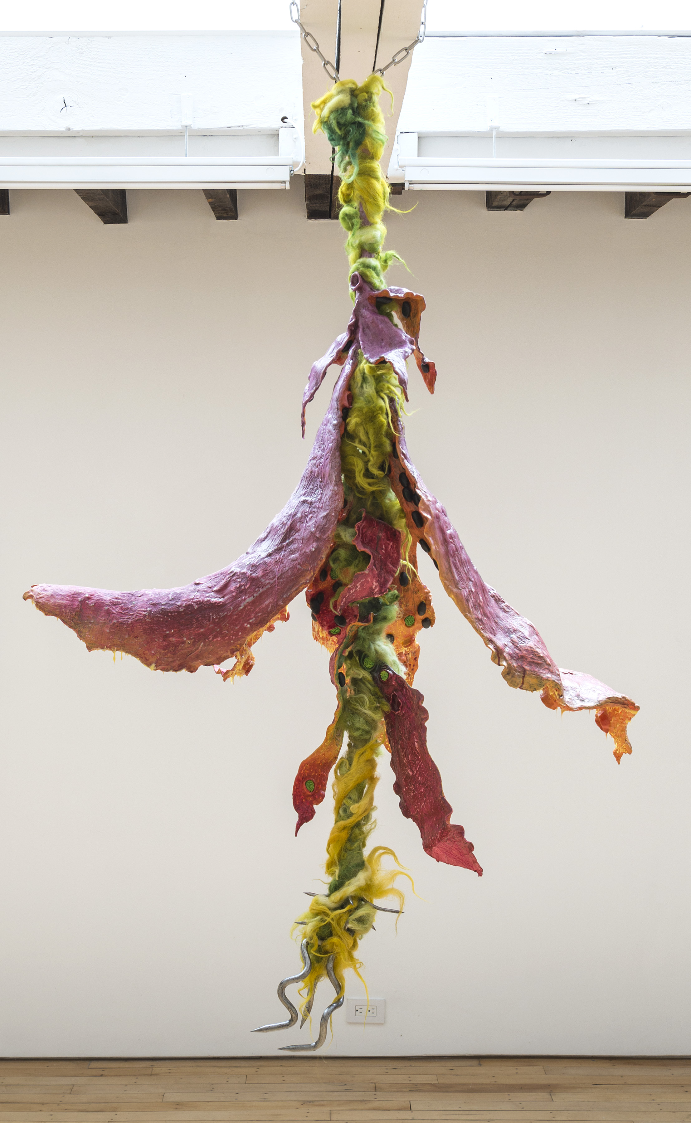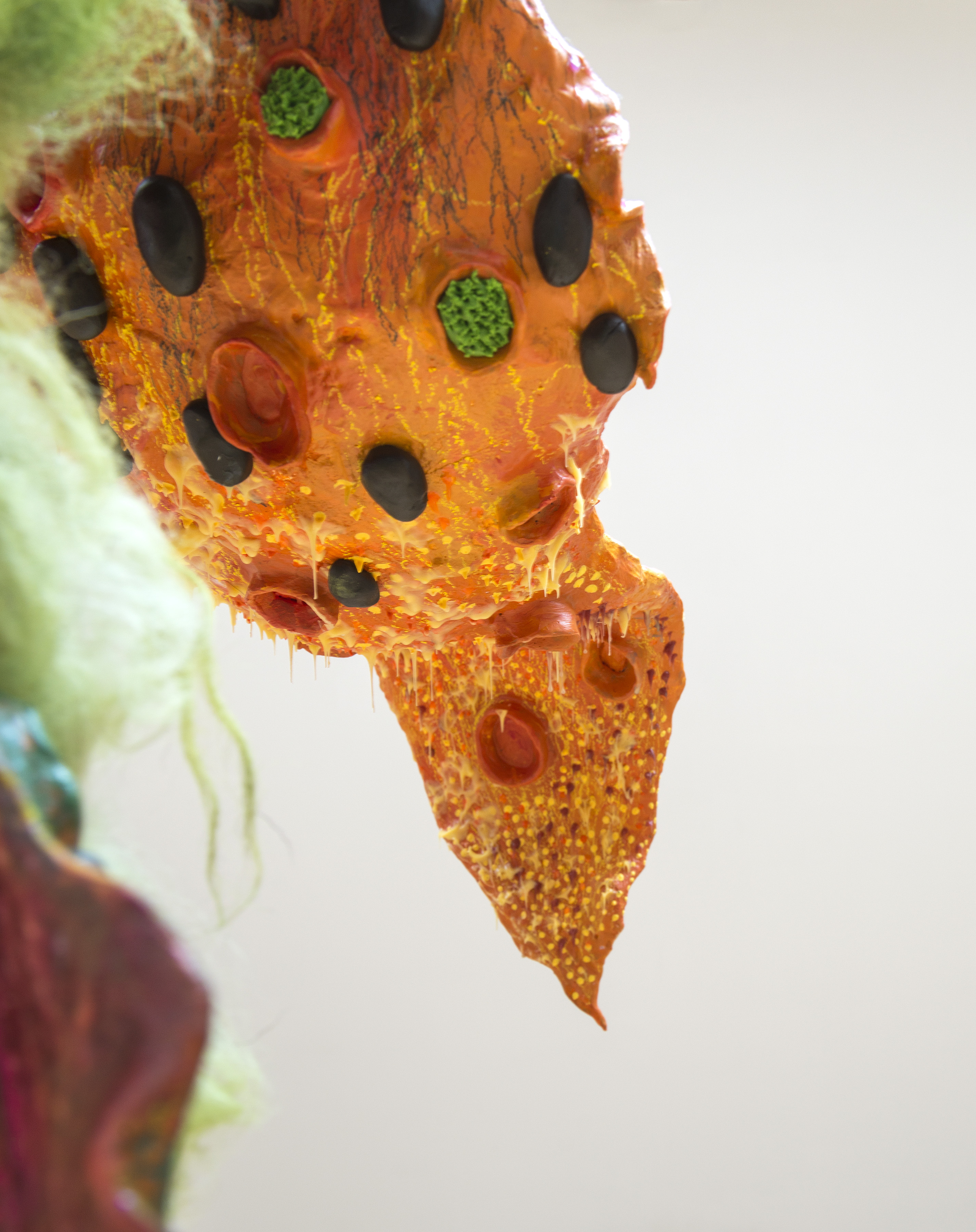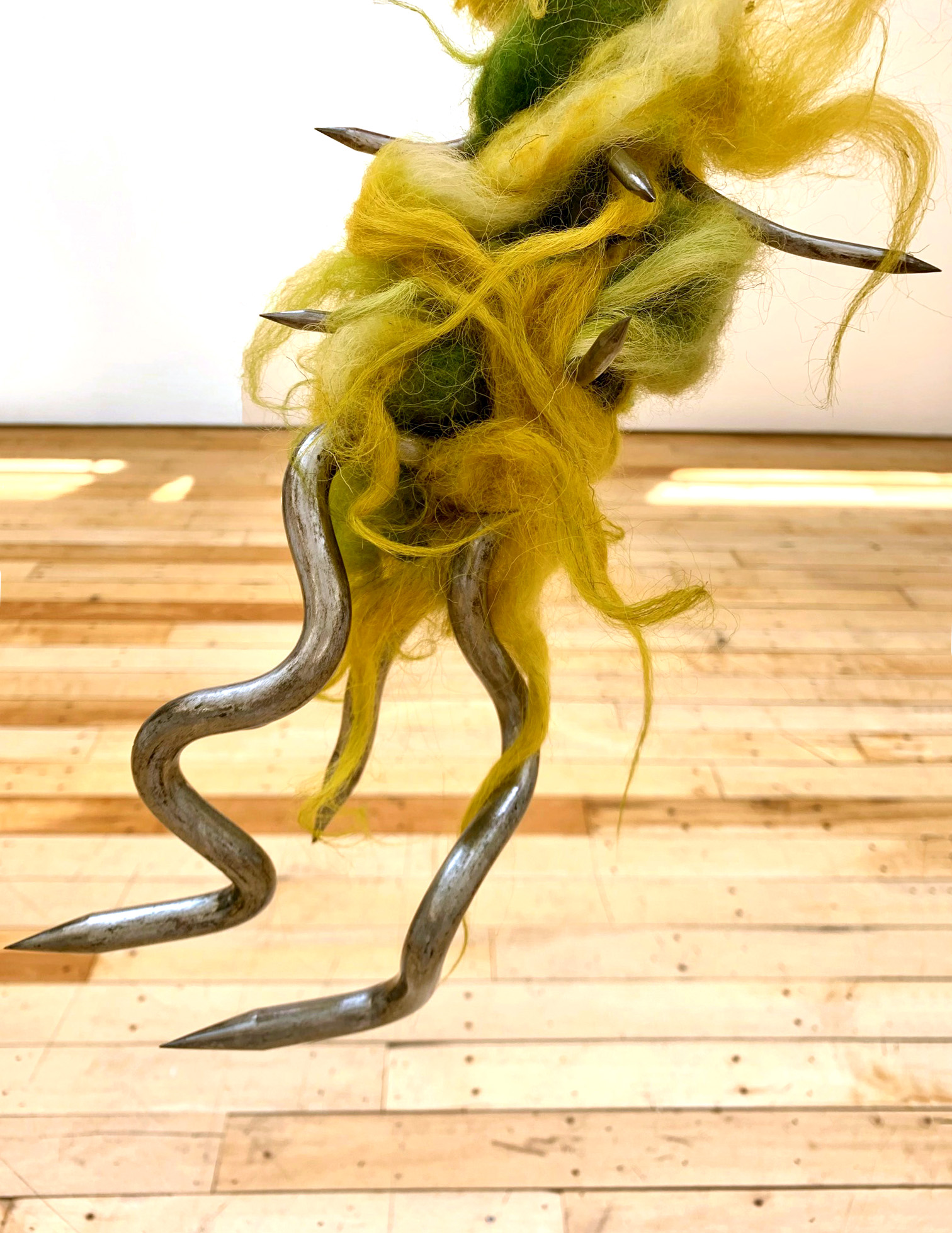 polished steel, cast aluminum, resin, wool roving, acrylic paint, resin clay, craft sand, silicone, pigmented wax