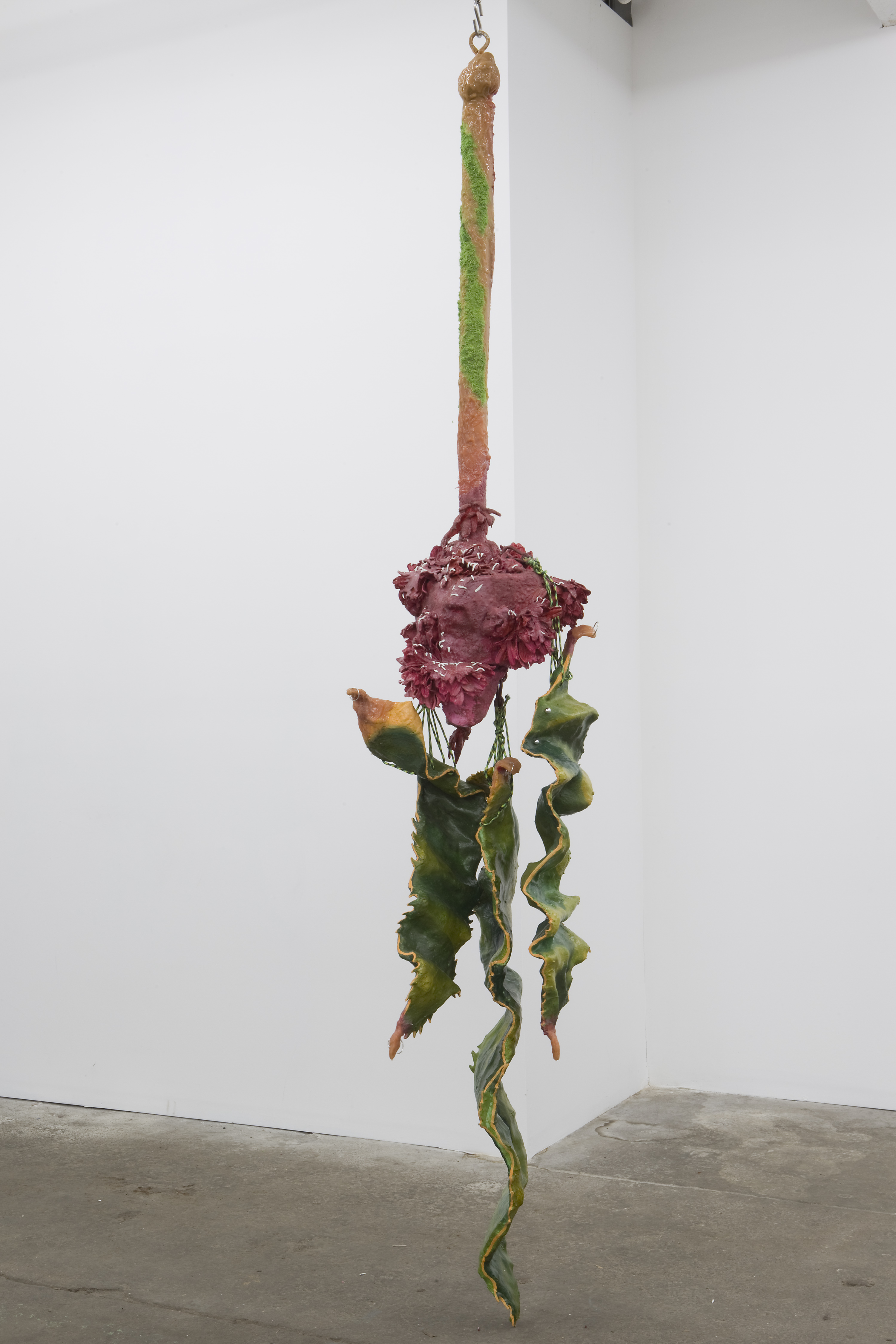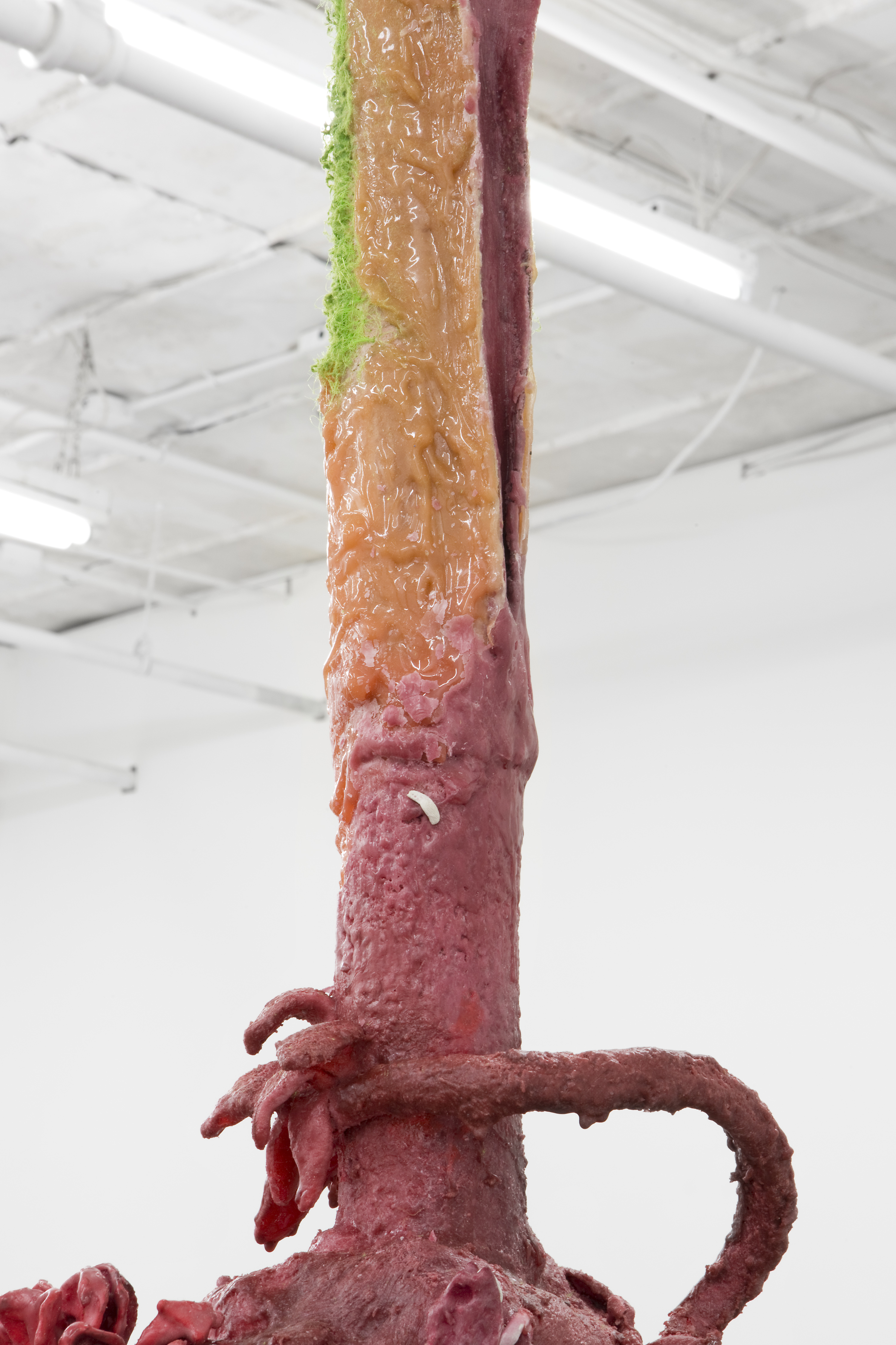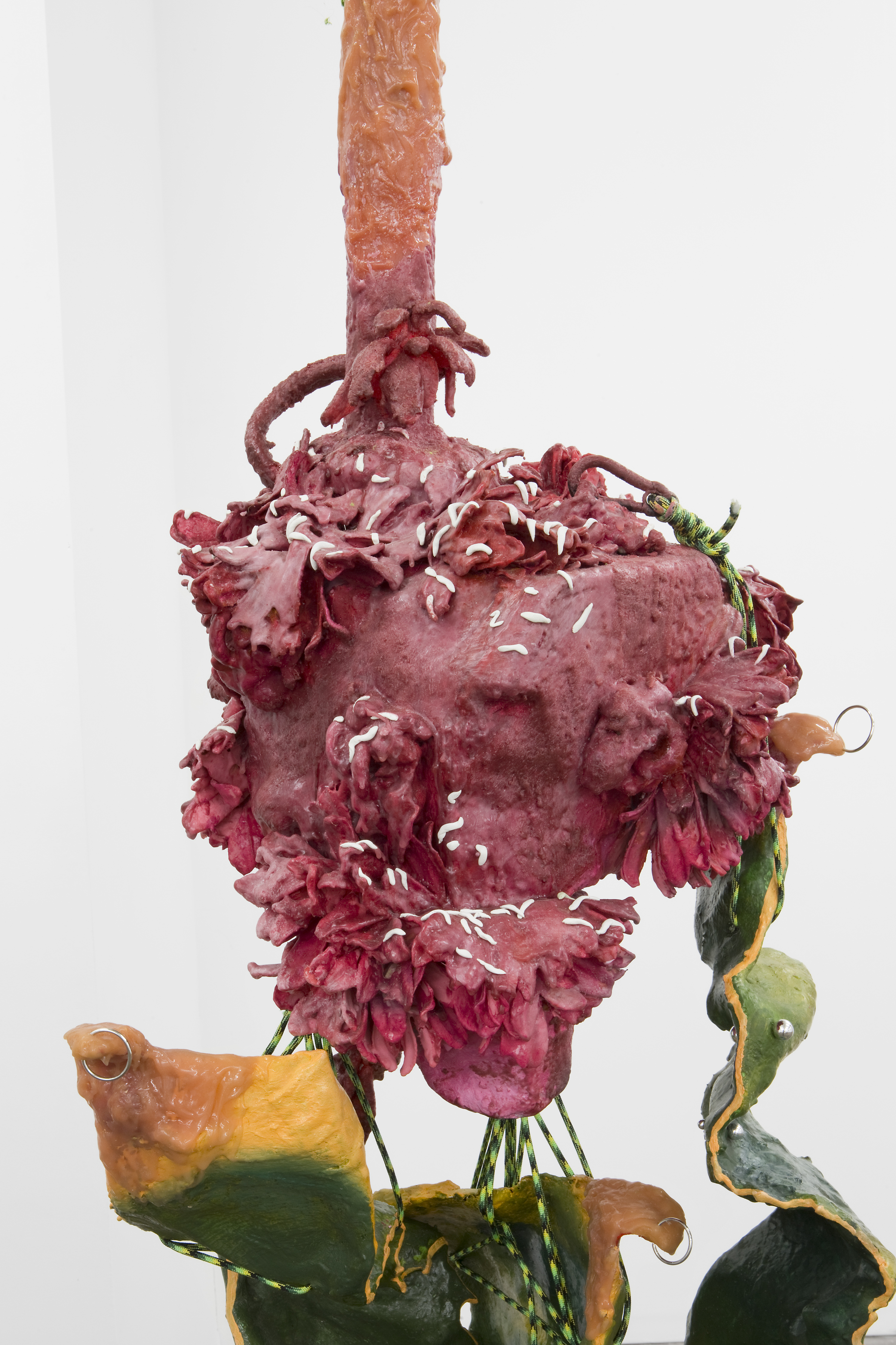 aqua resin, resin clay, rubber, synthetic hair, wax, silver hoop earrings, and rope