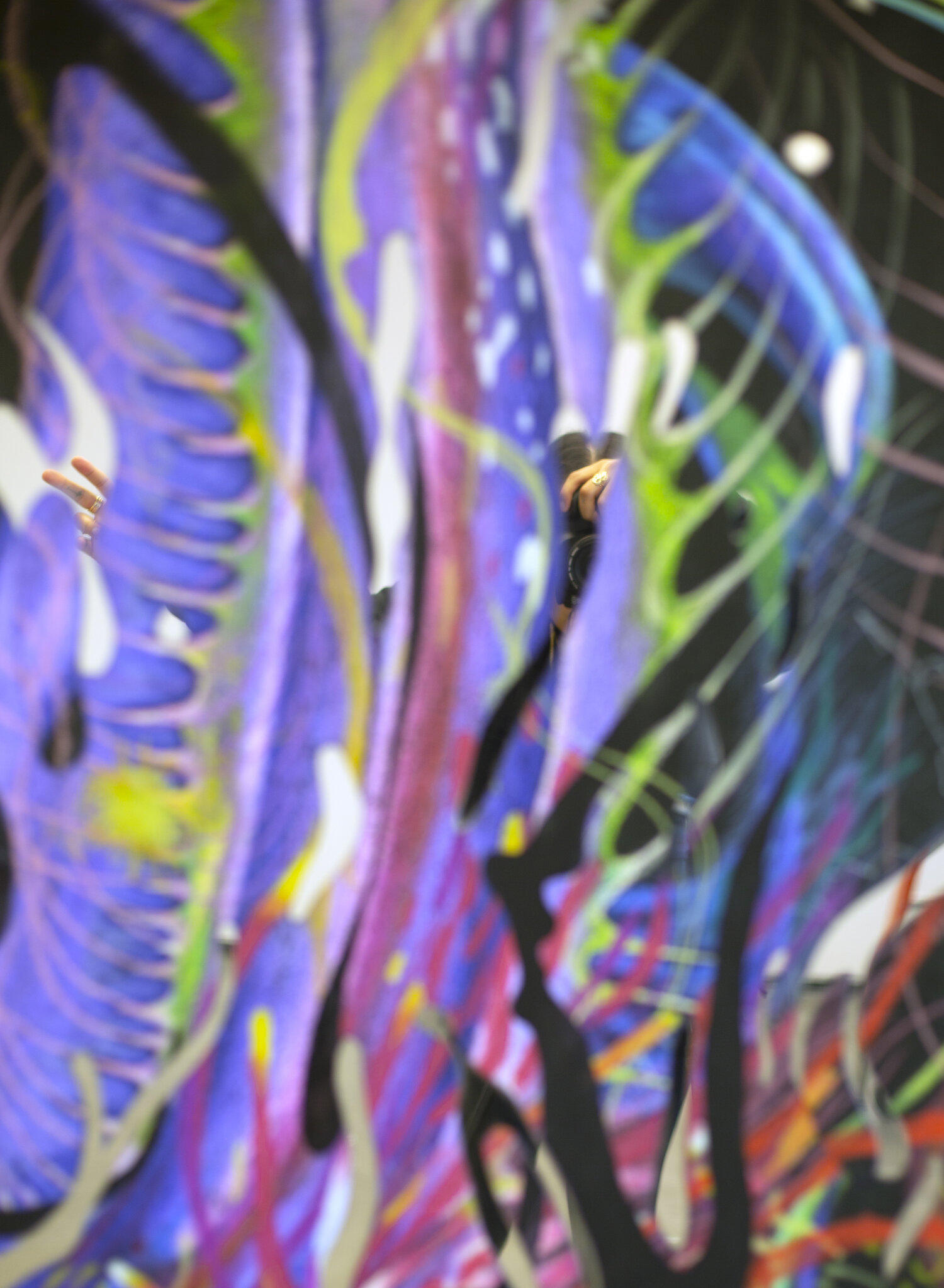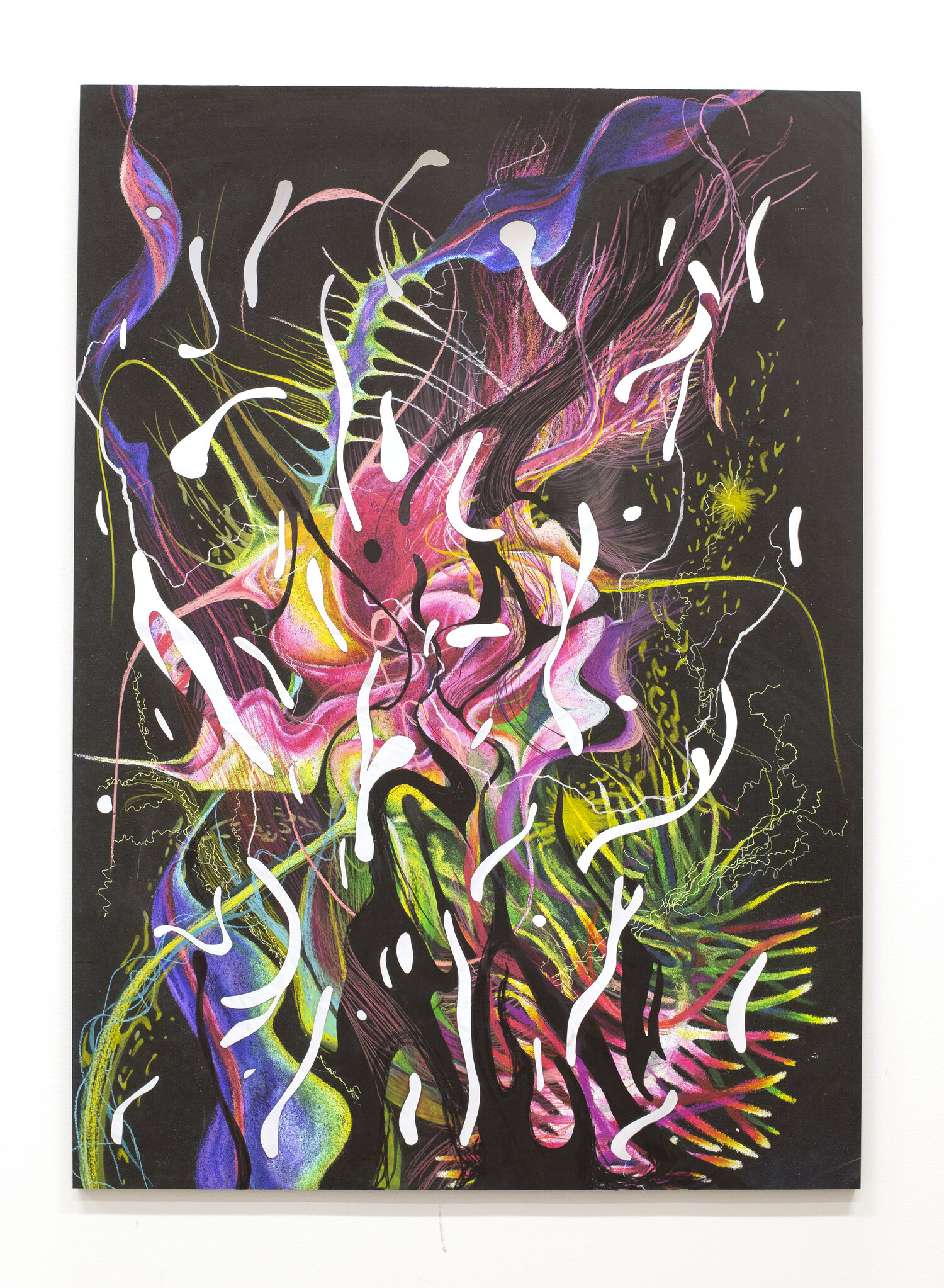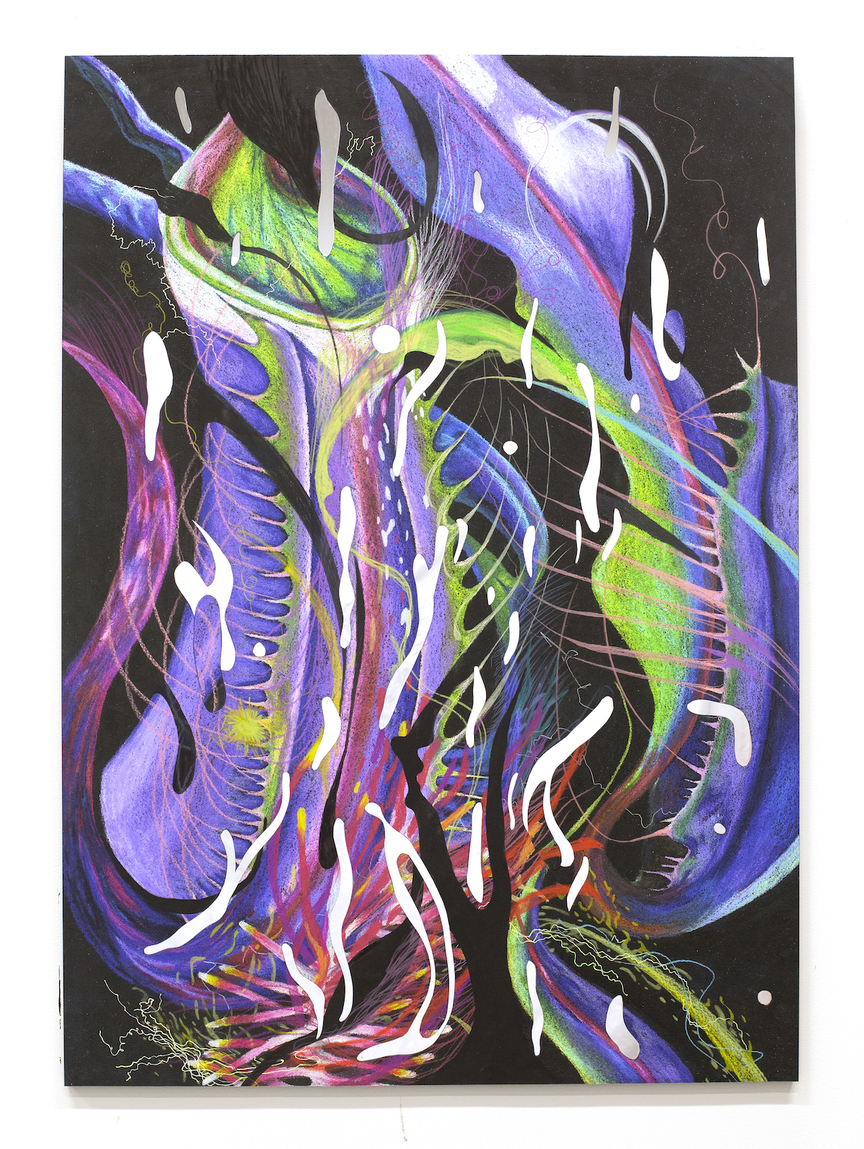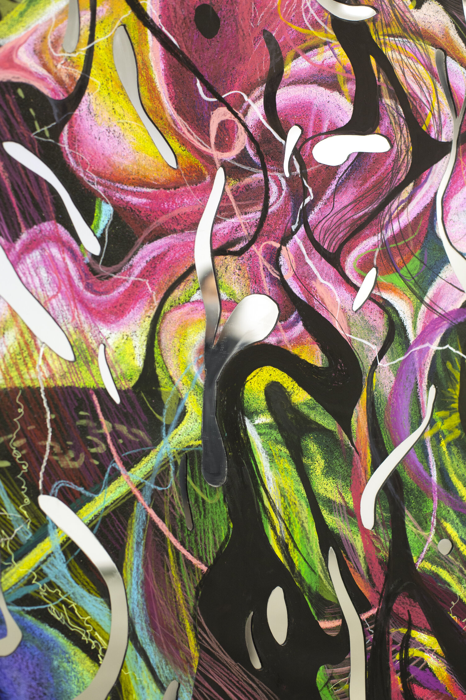 color pencil, market, pen, pastels on inkjet print, mounted on acrylic mirror