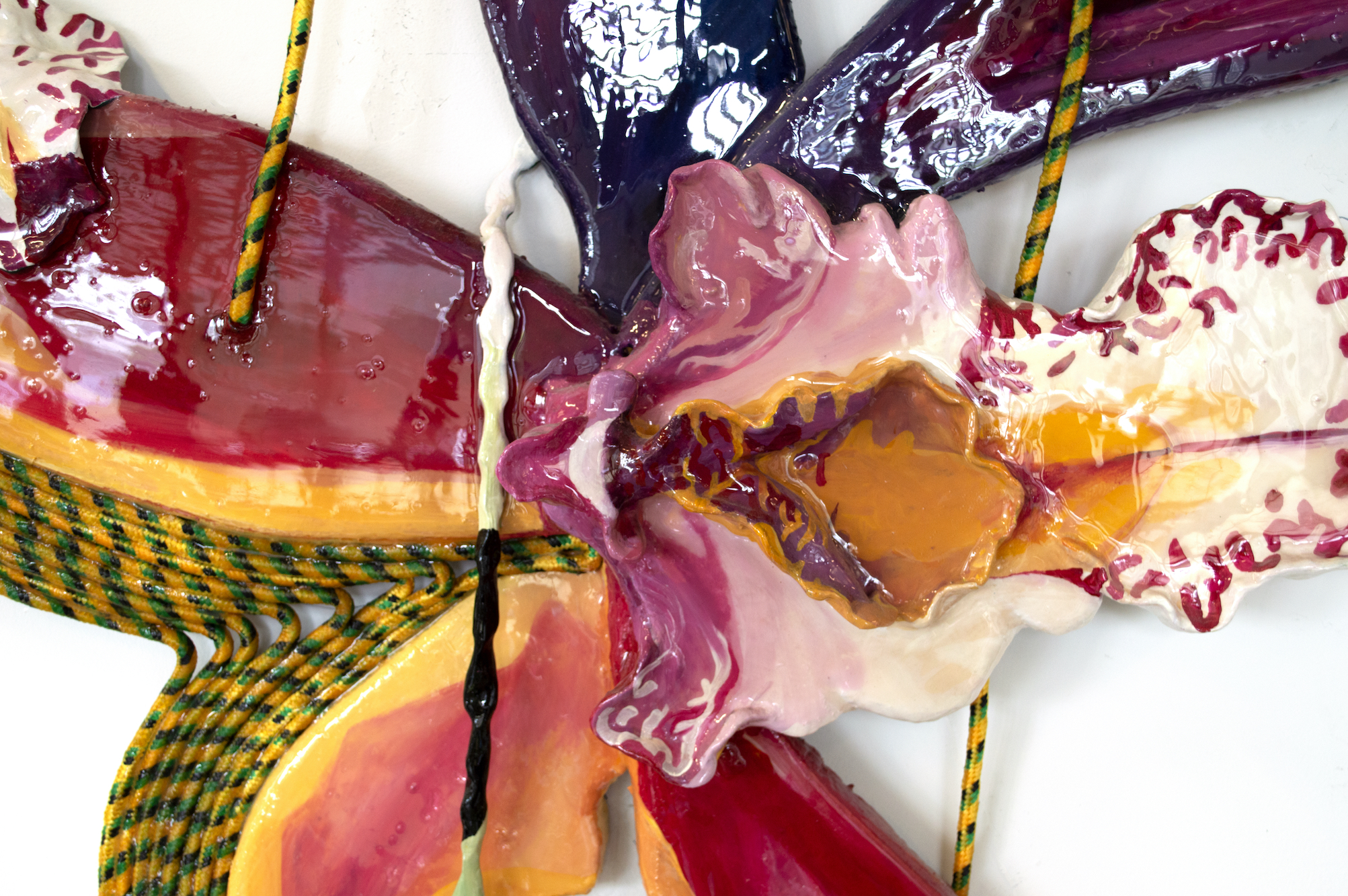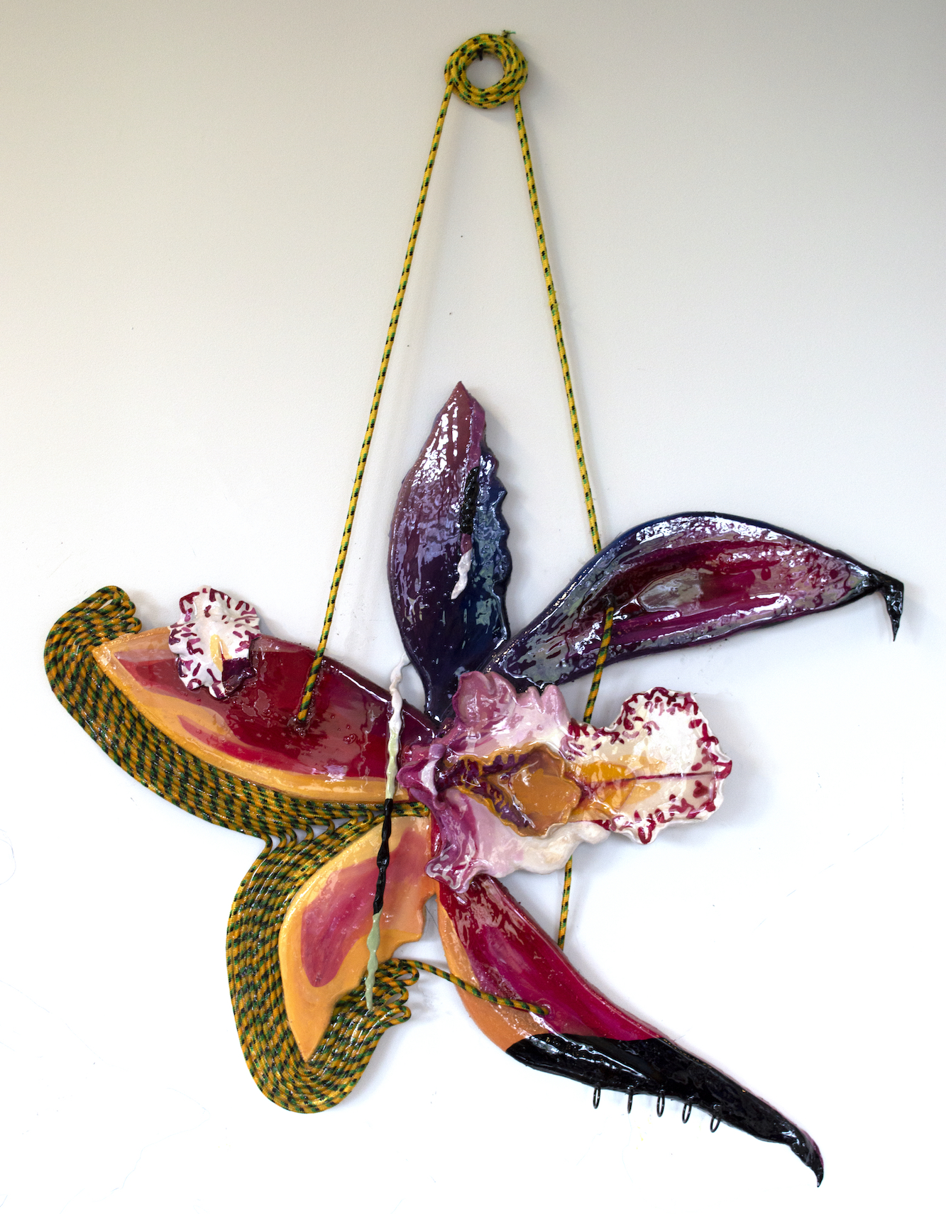 foam, resin clay, acrylic paint, epoxy resin, metal hardware, rope