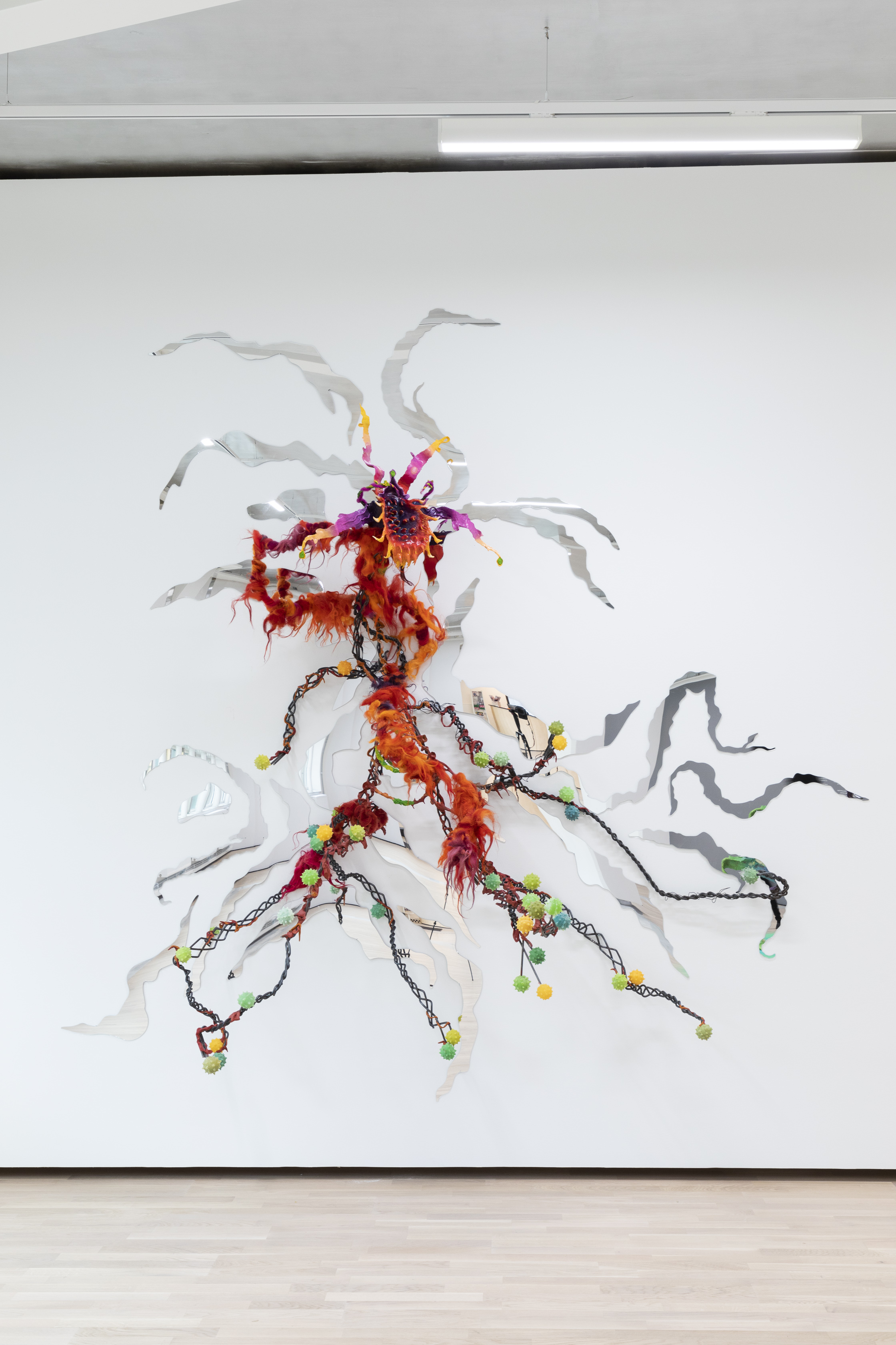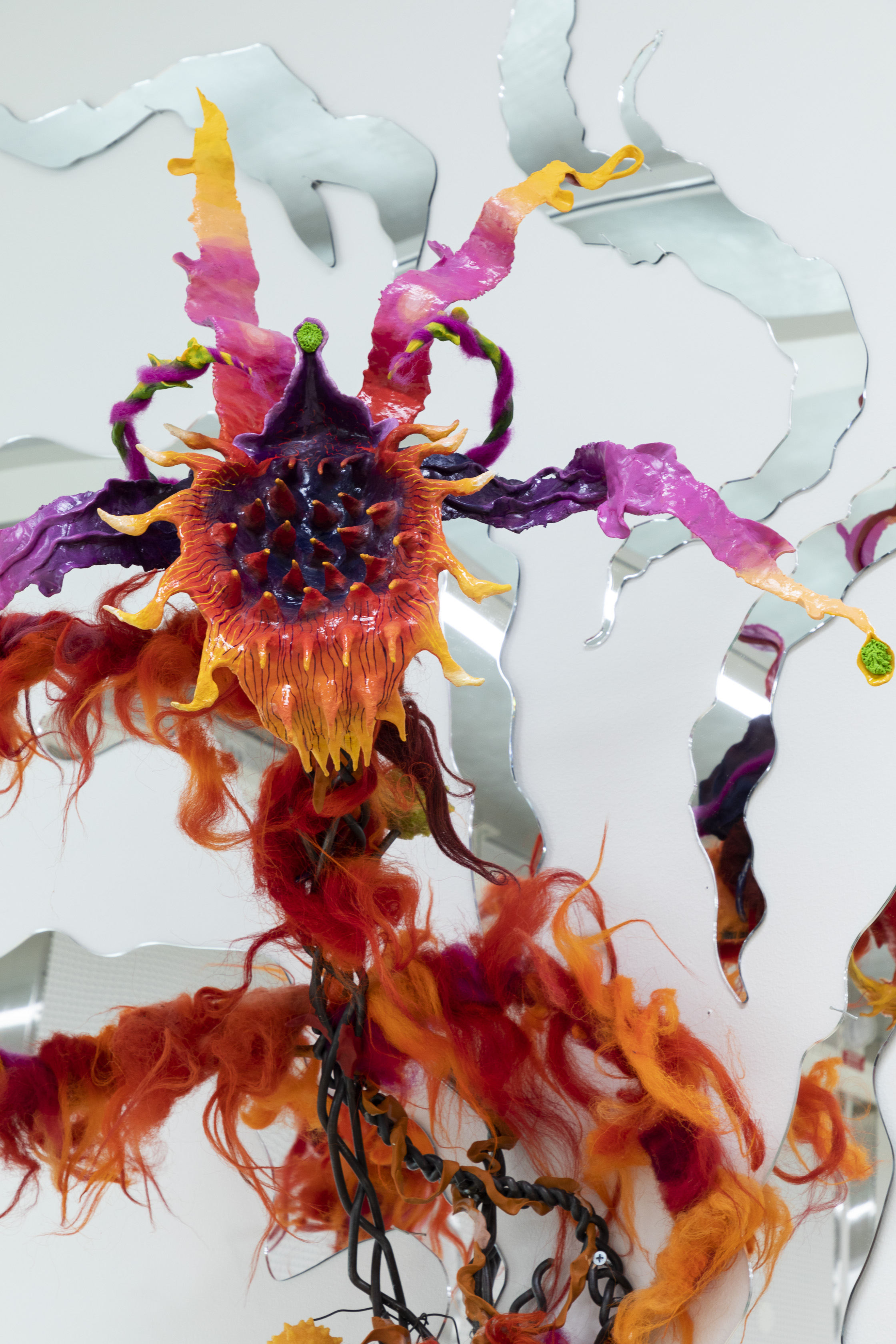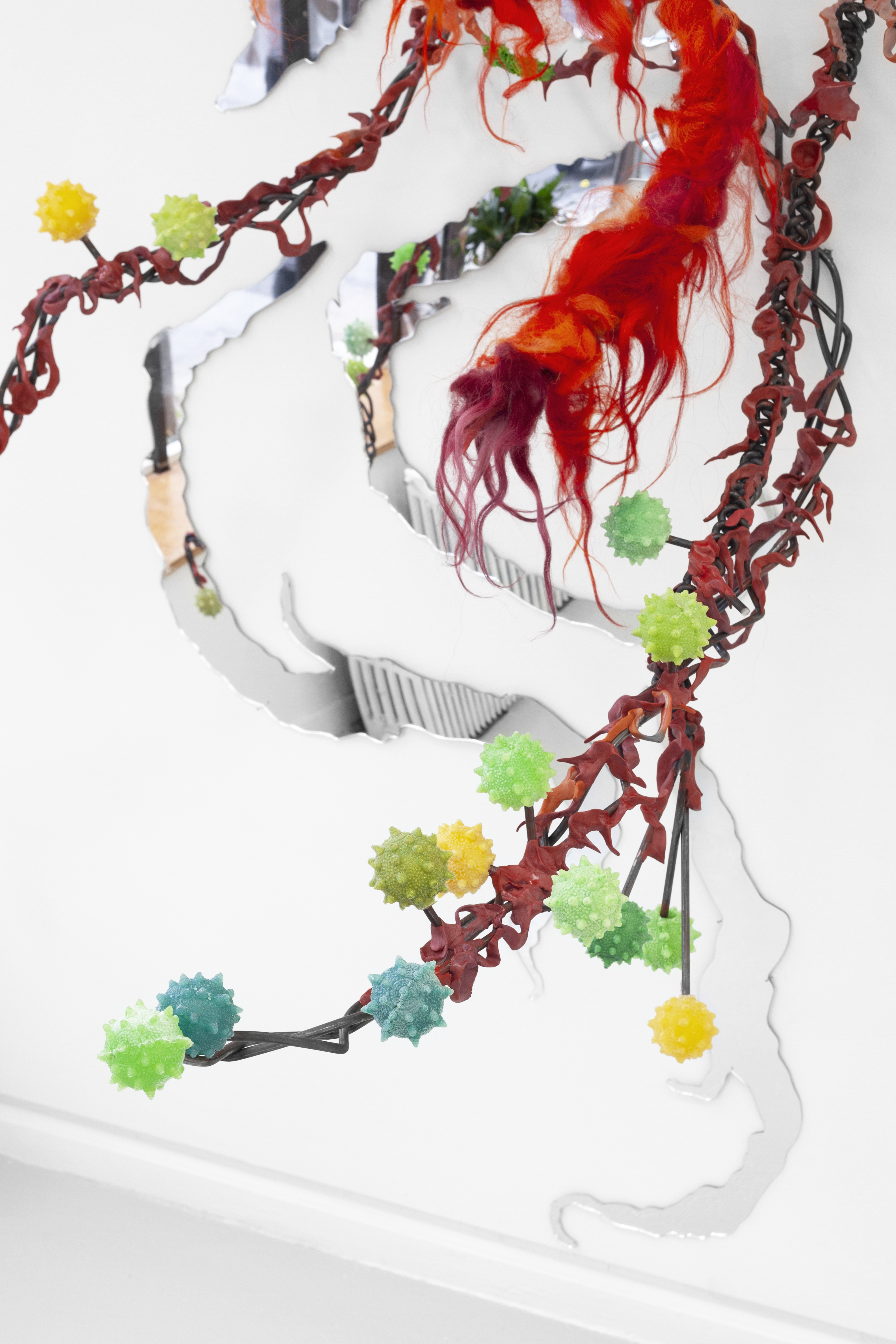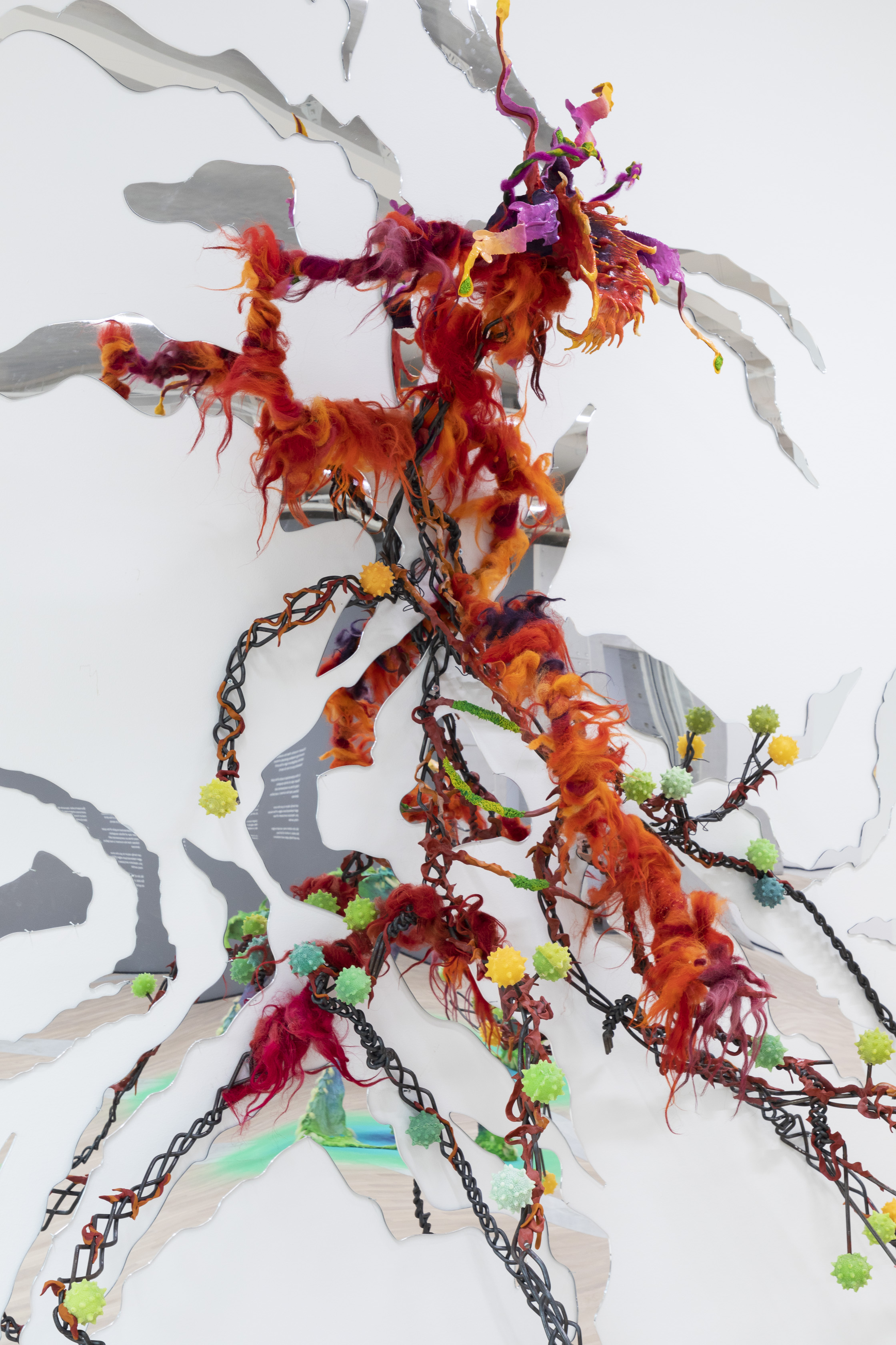 braided steel, resin clay, dyed wool, epoxy resin, acrylic mirror