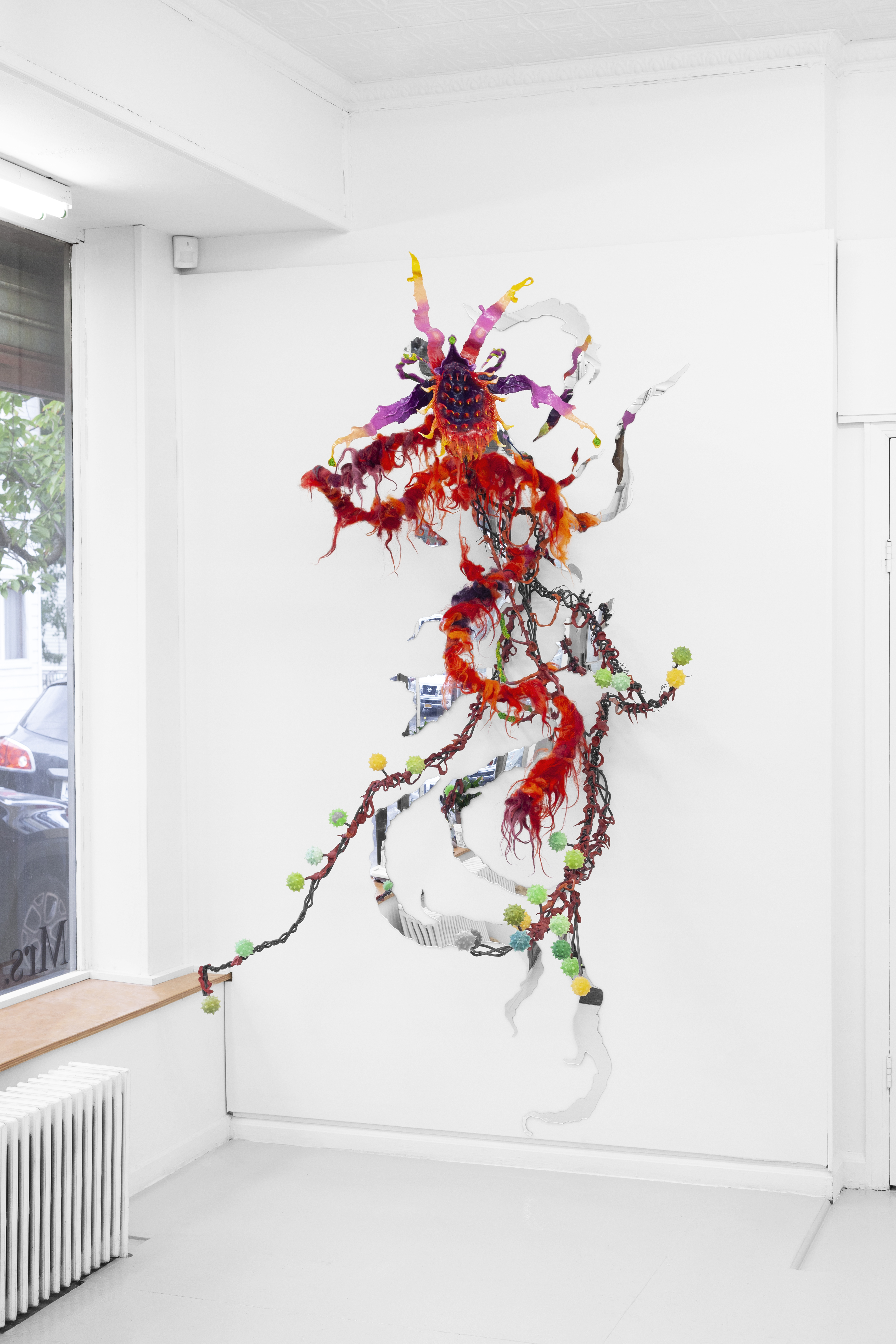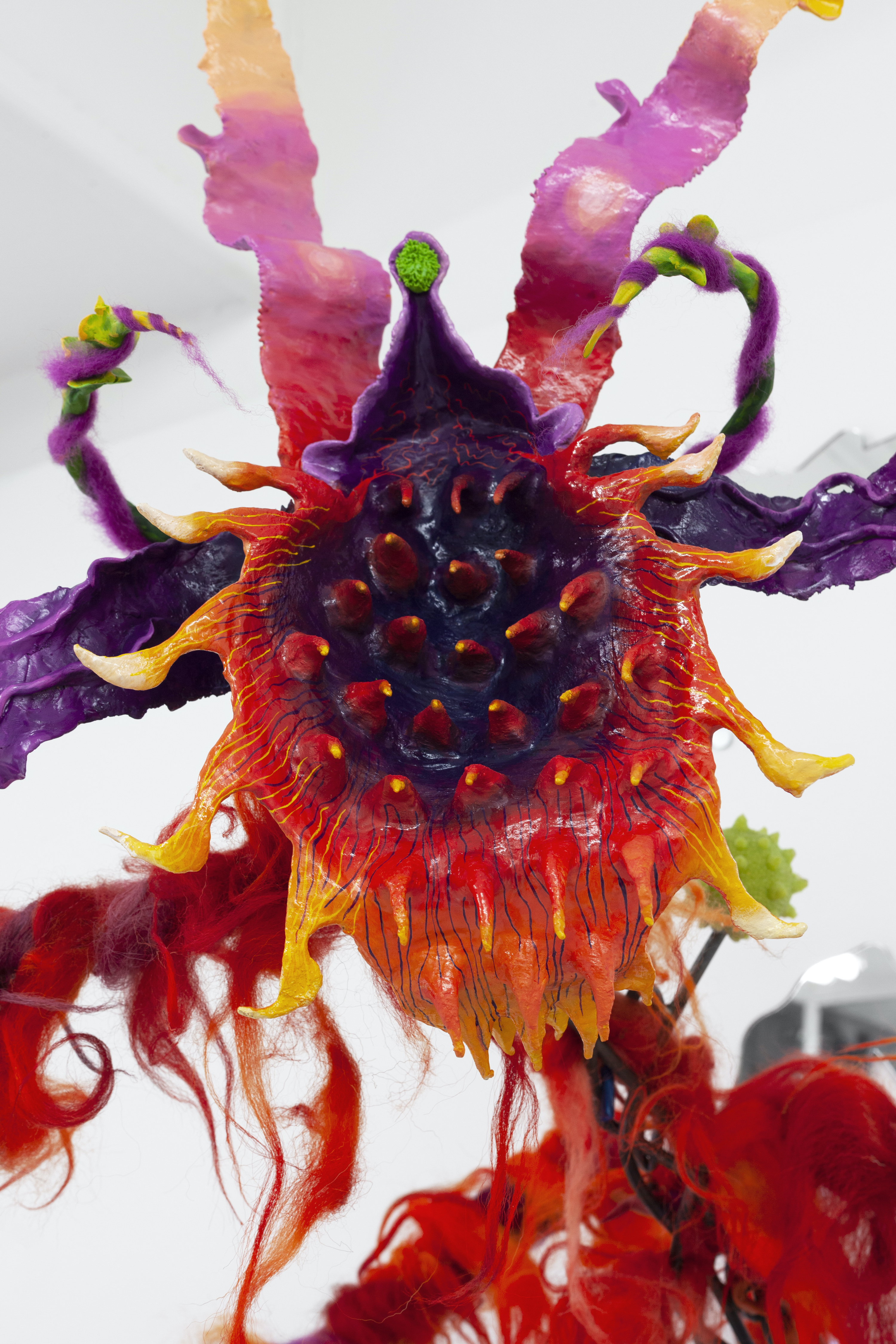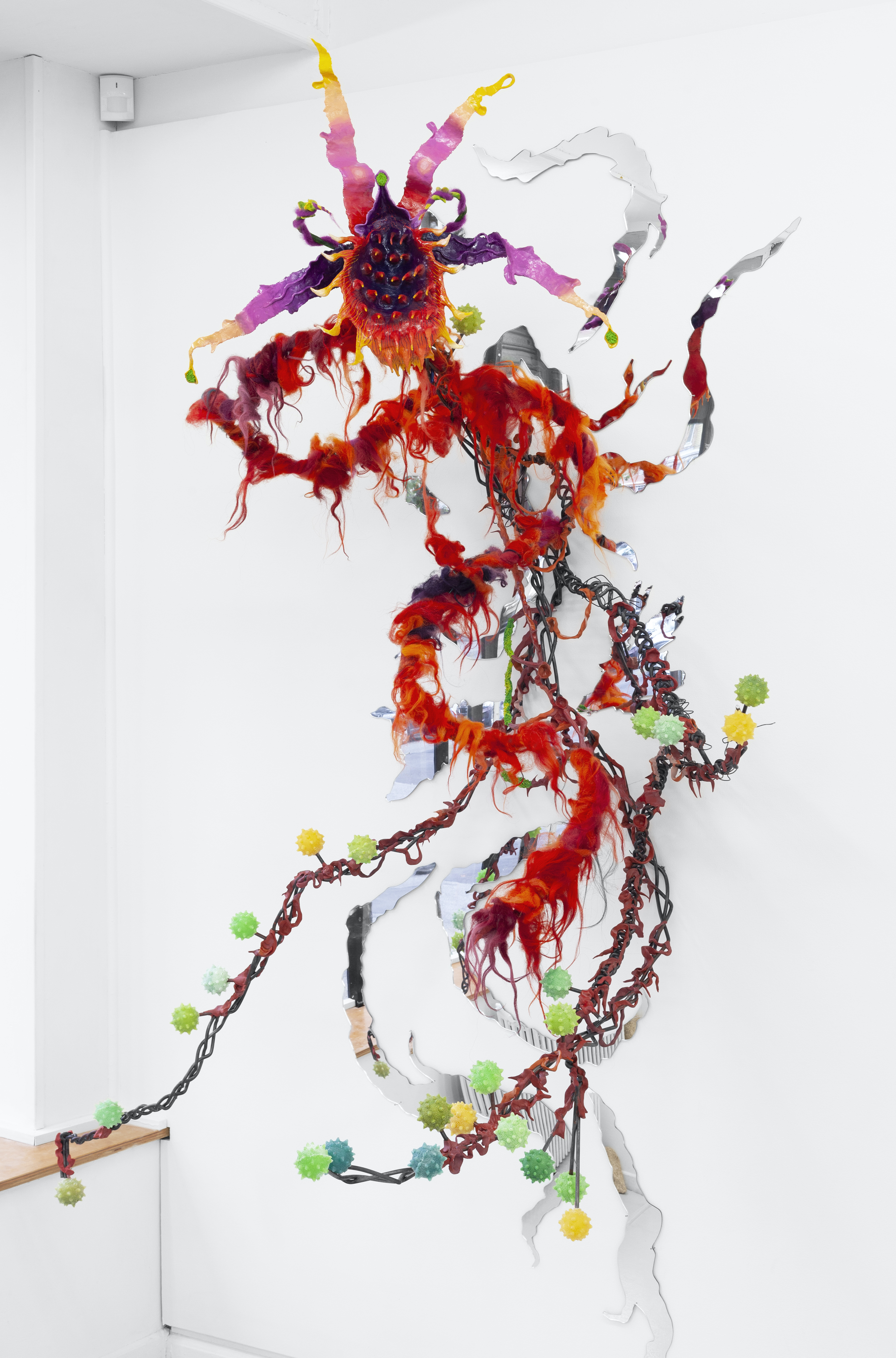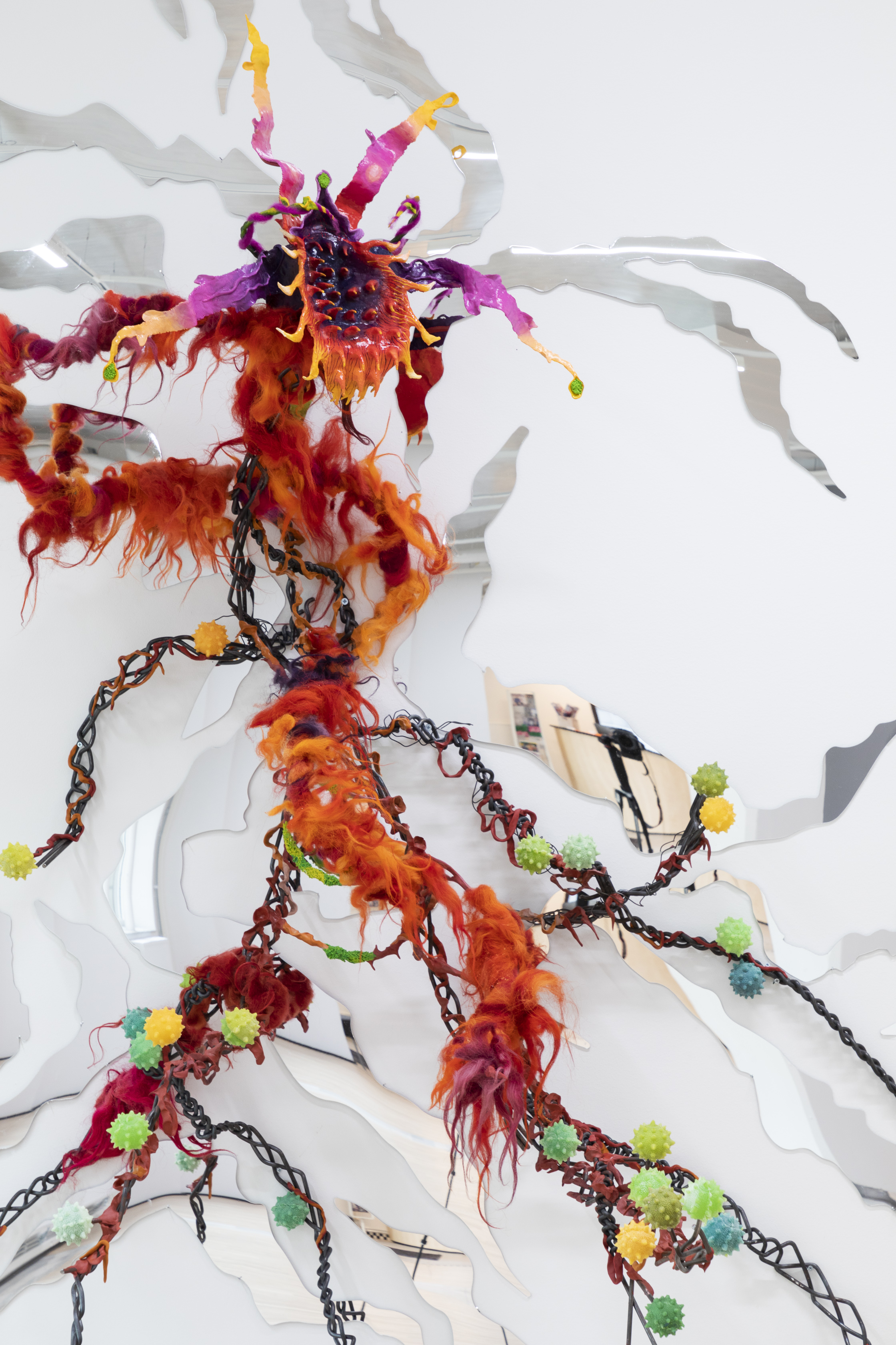 braided steel, resin clay, dyed wool, epoxy resin, acrylic mirror