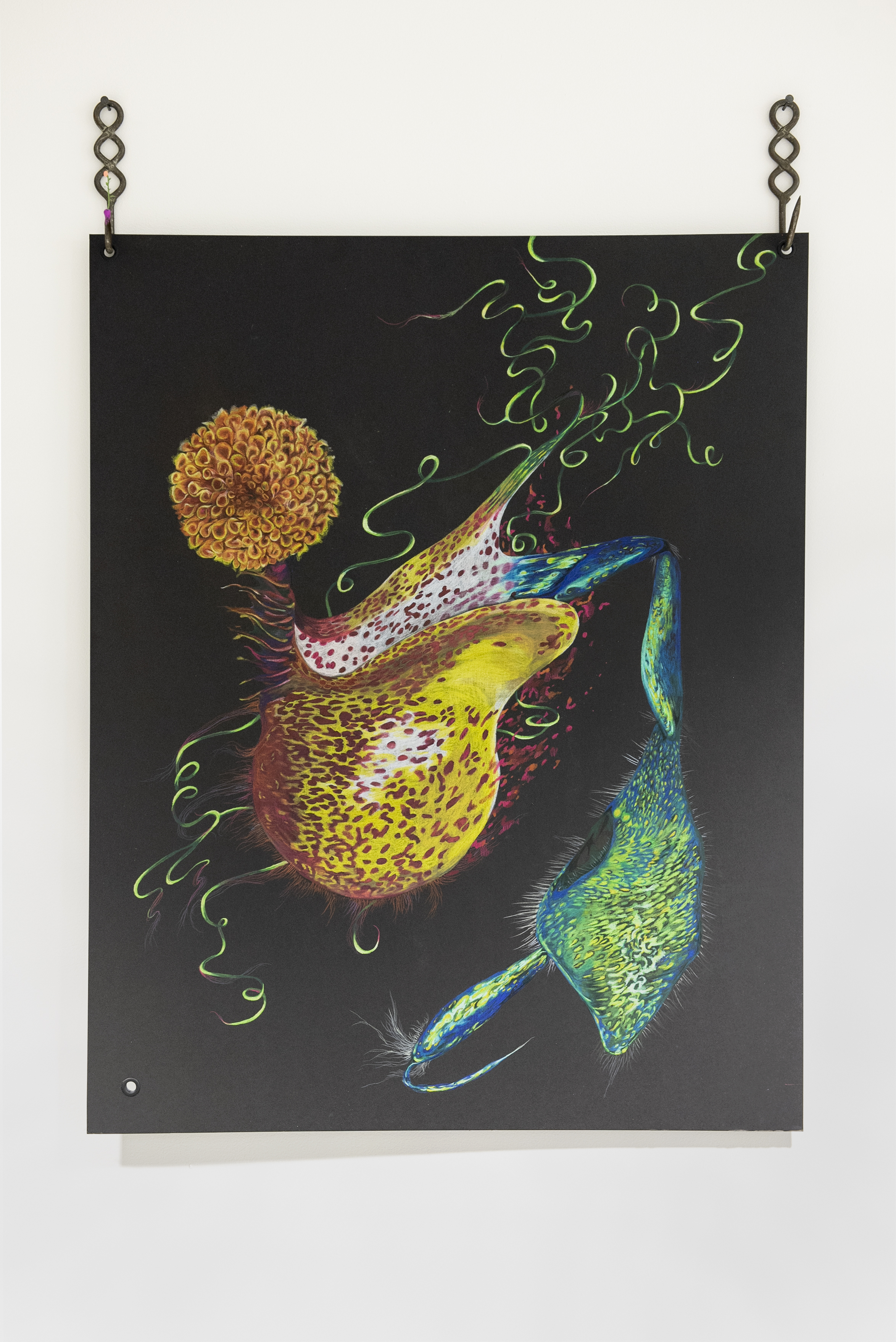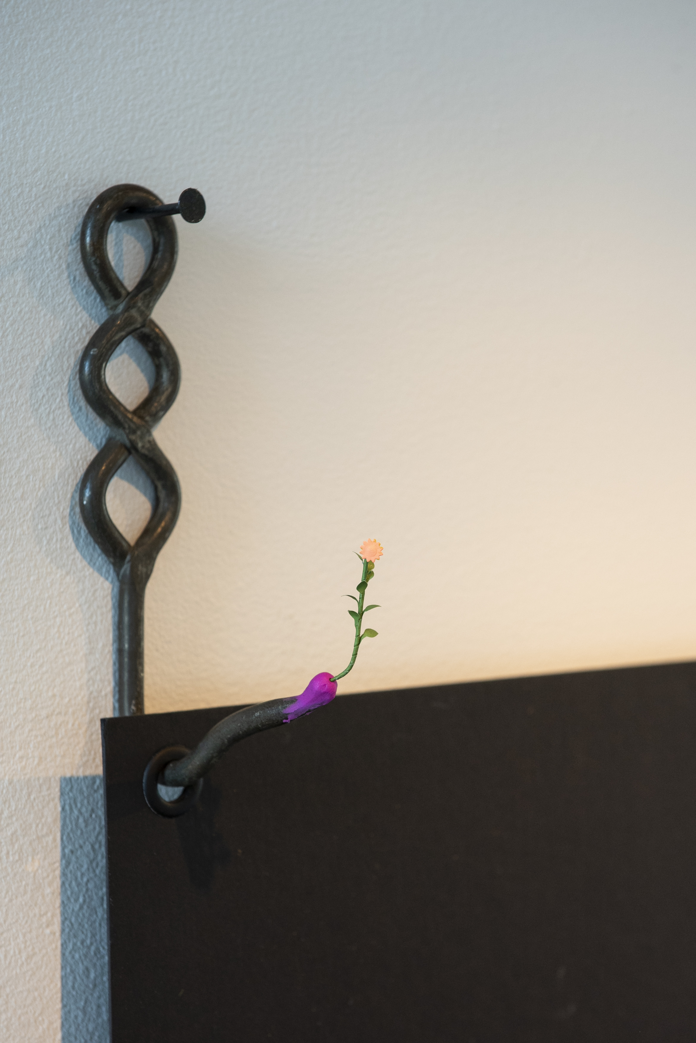 black cardstock, color pencil, steel hooks, sculpey clay, miniature paper flower, mirror.